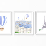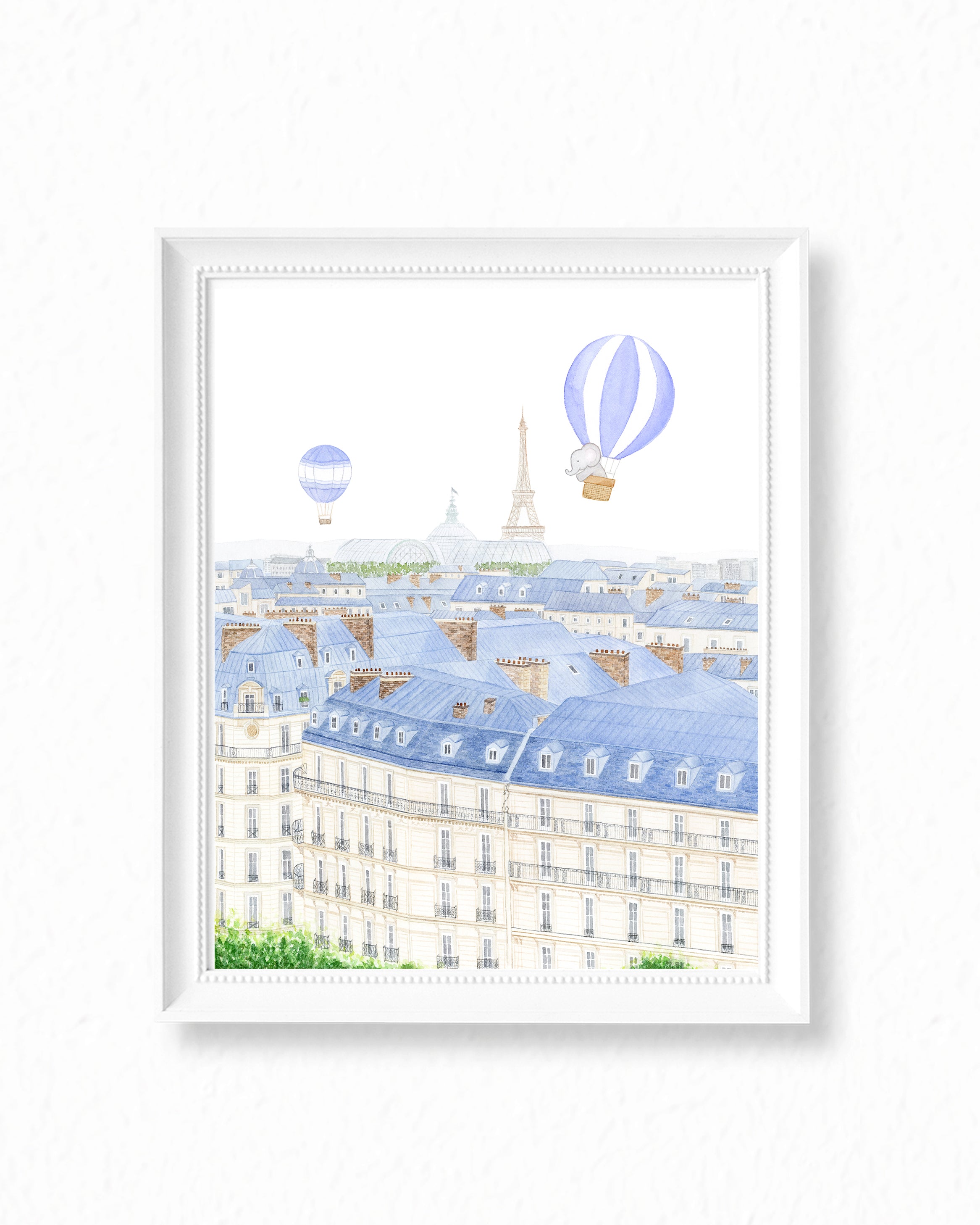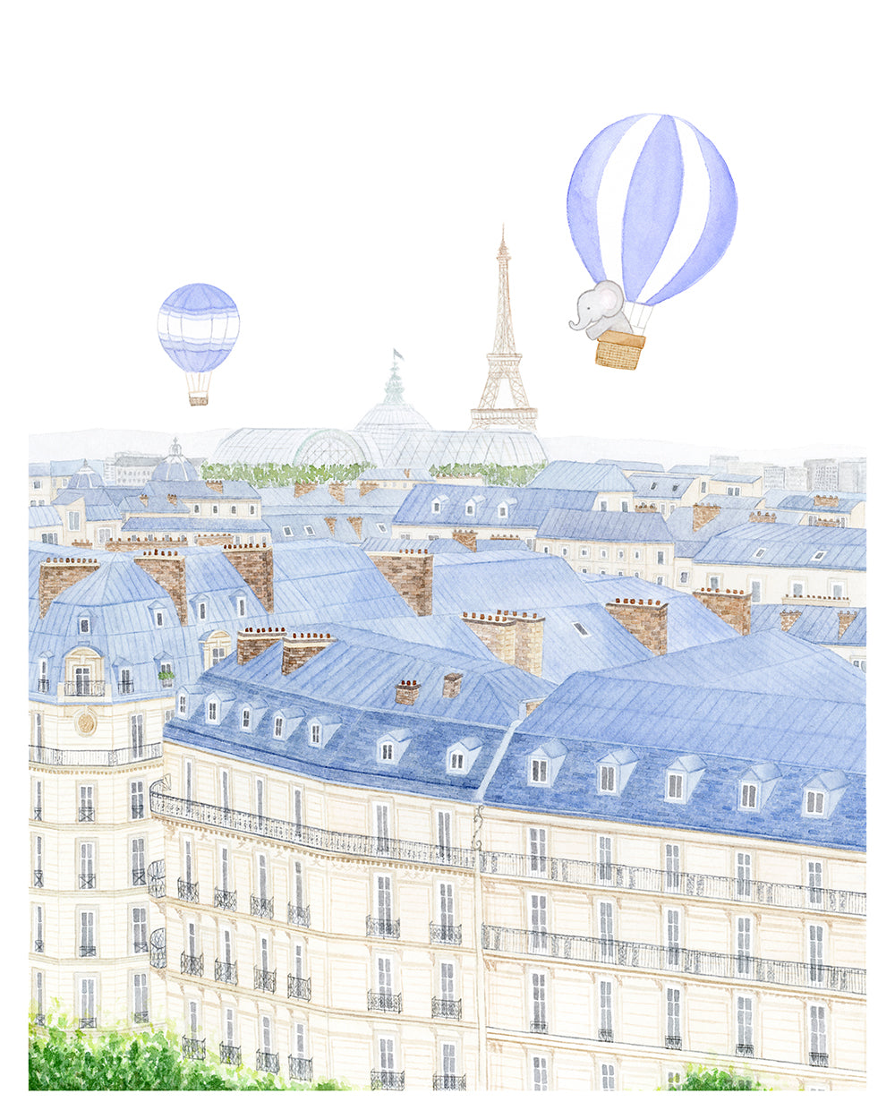 Daydream away while gazing at these Parisian rooftops - you can see the Eiffel Tower, Grand Palais, and hot air balloons in this scene. This original watercolor painting is part of a series. Baby Emma the Elephant travels the world and explores iconic locations.