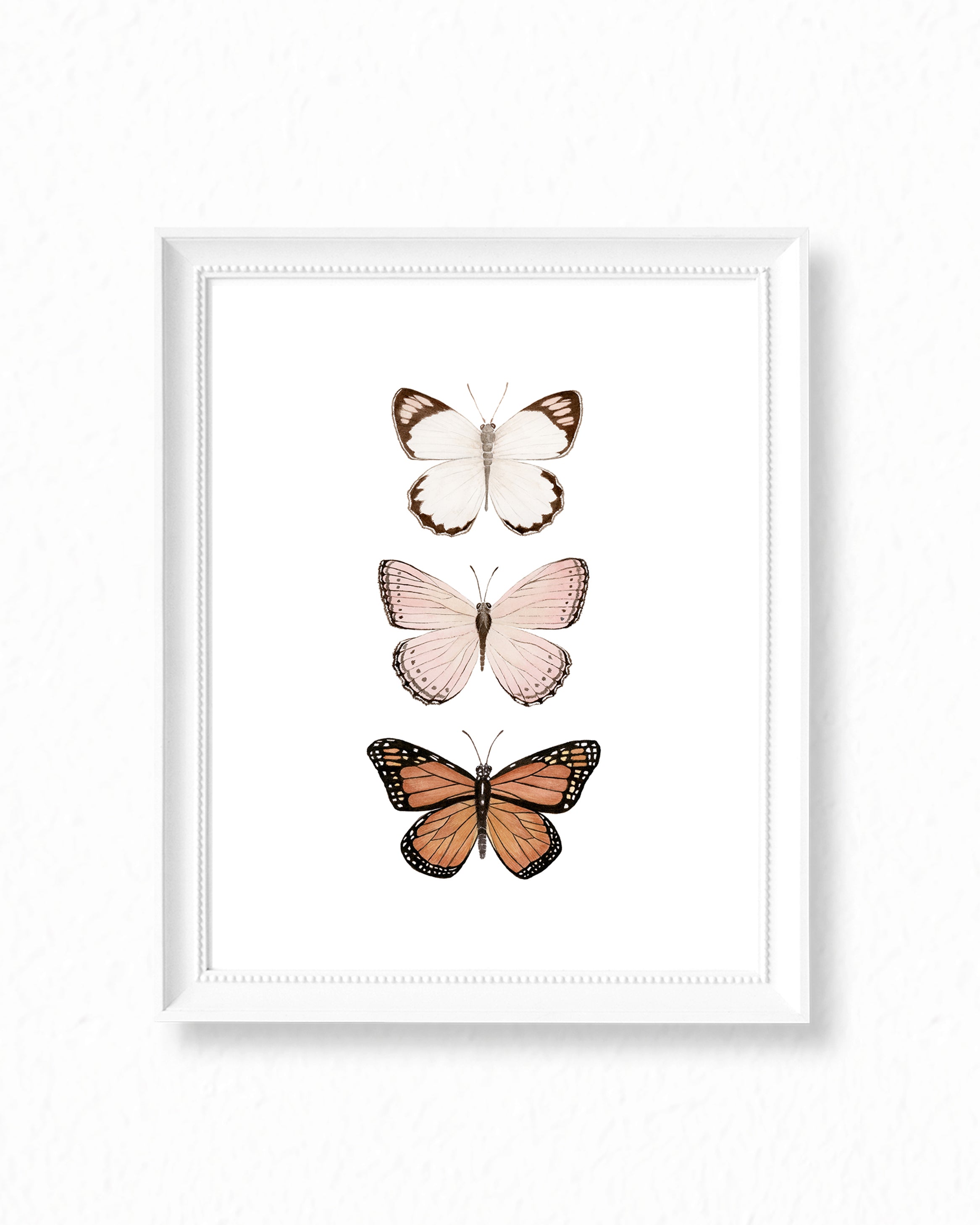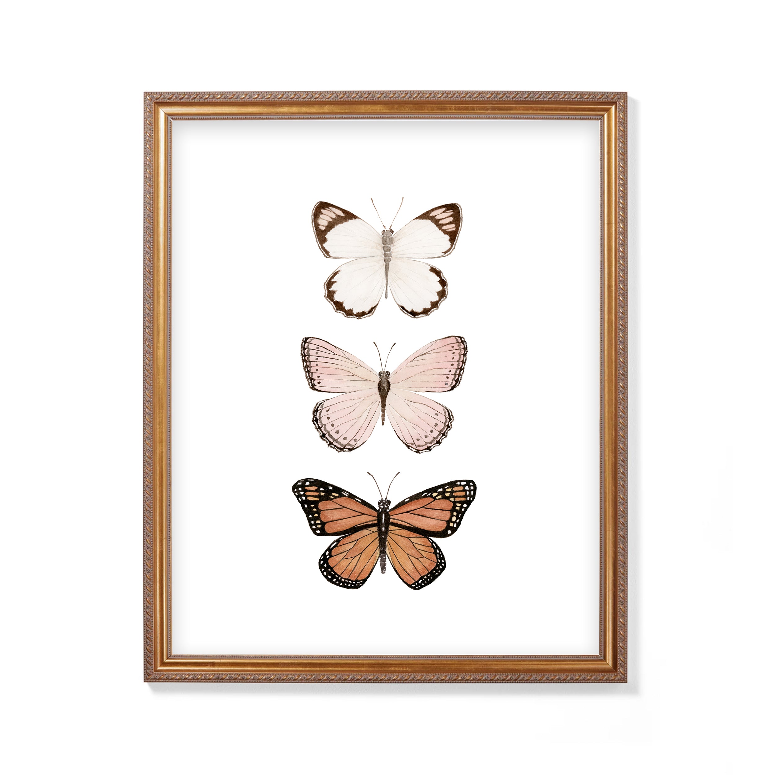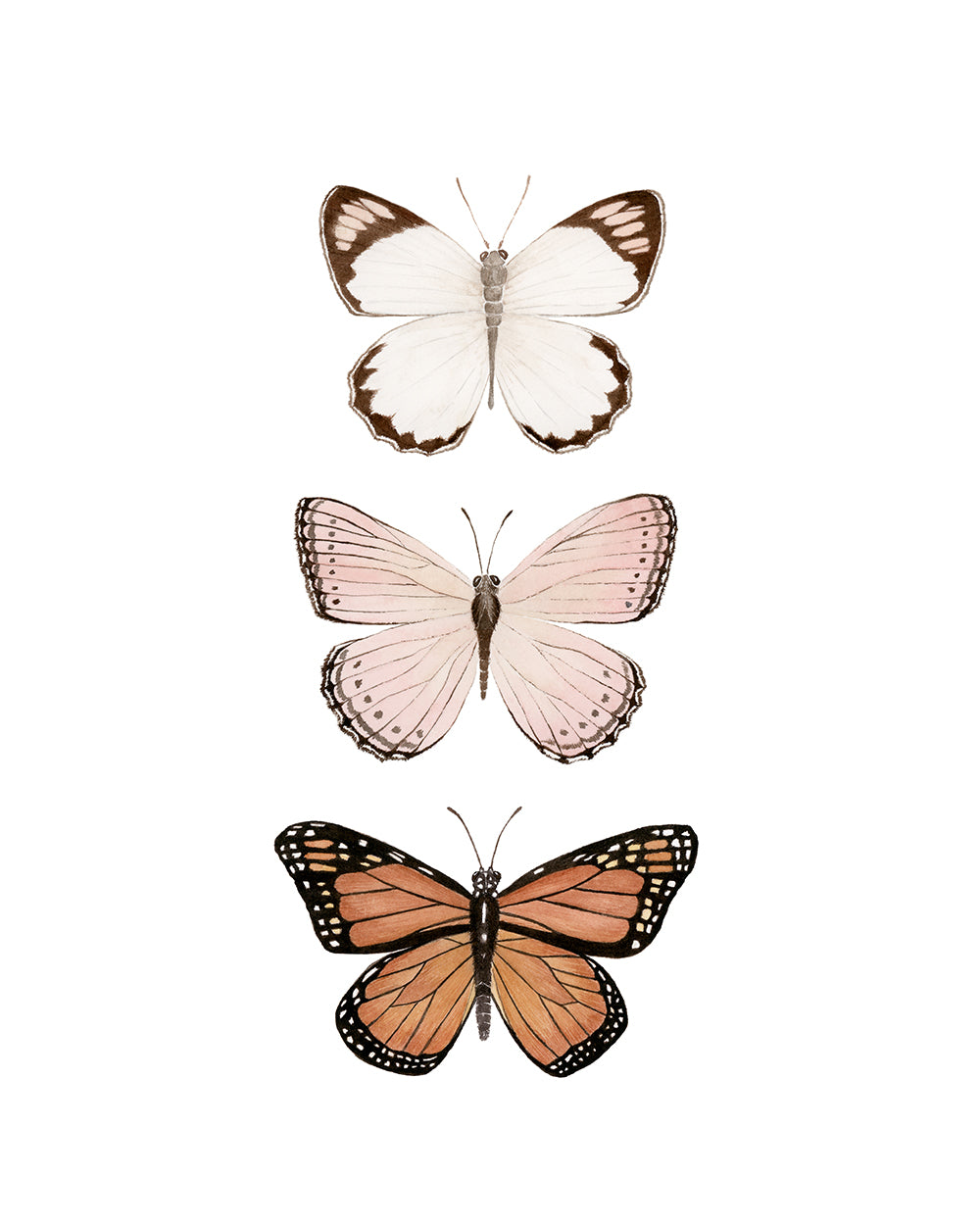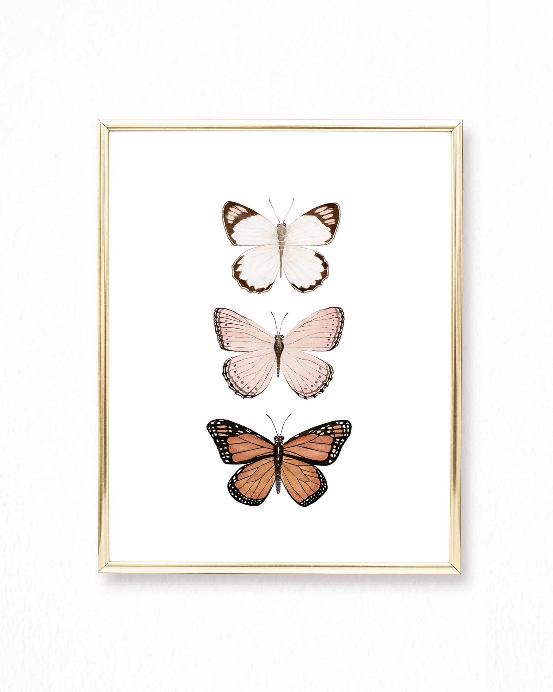 Watercolor painting of a trio of butterflies. This set of butterflies was painted with a neutral color palette in mind. Perfect when framed on a blush, pale pink, or cream wall, evoking bohemian and rustic vibes. Pairs well with natural wood furniture and antique golden mirrors. Daydream away in the world of these magical butterflies.
