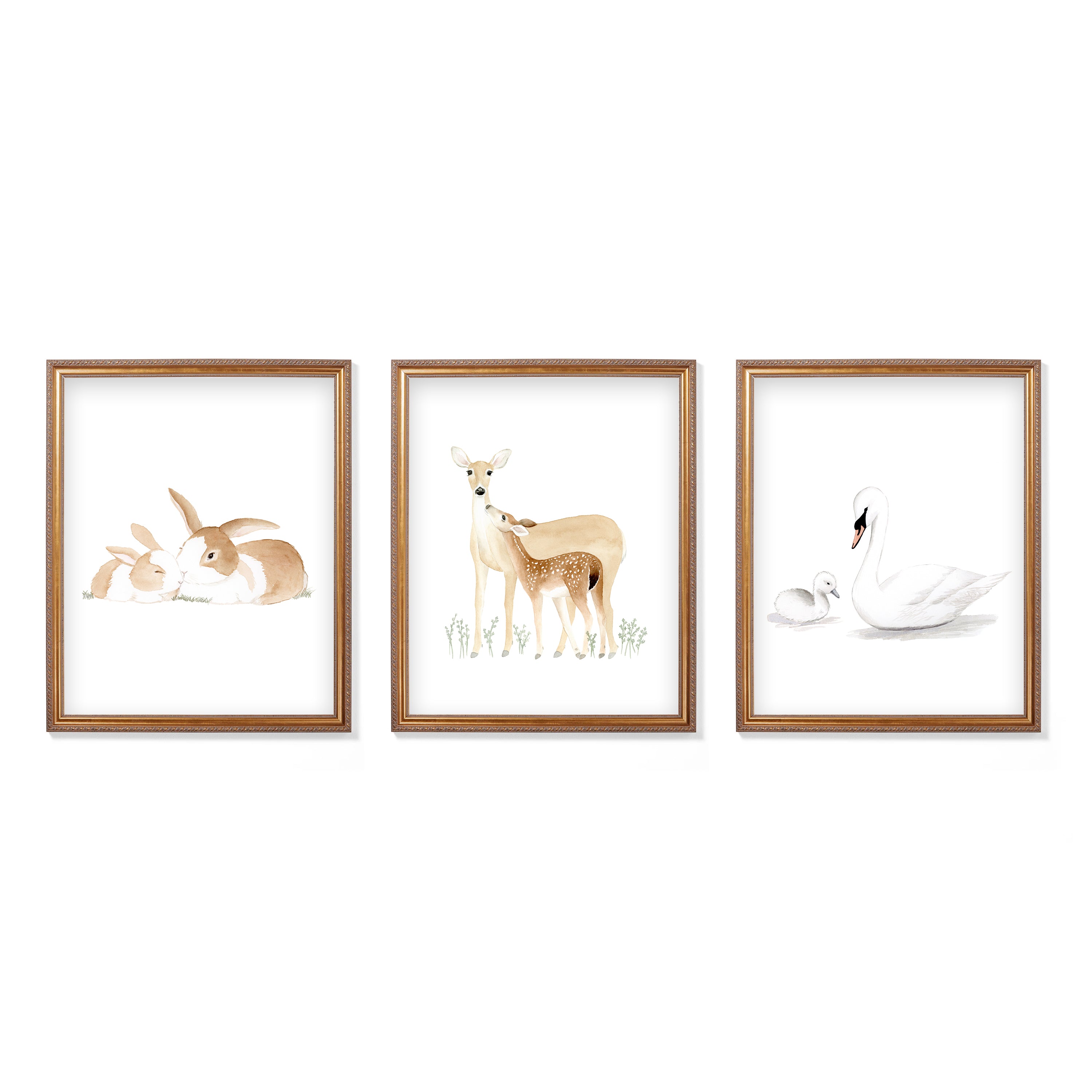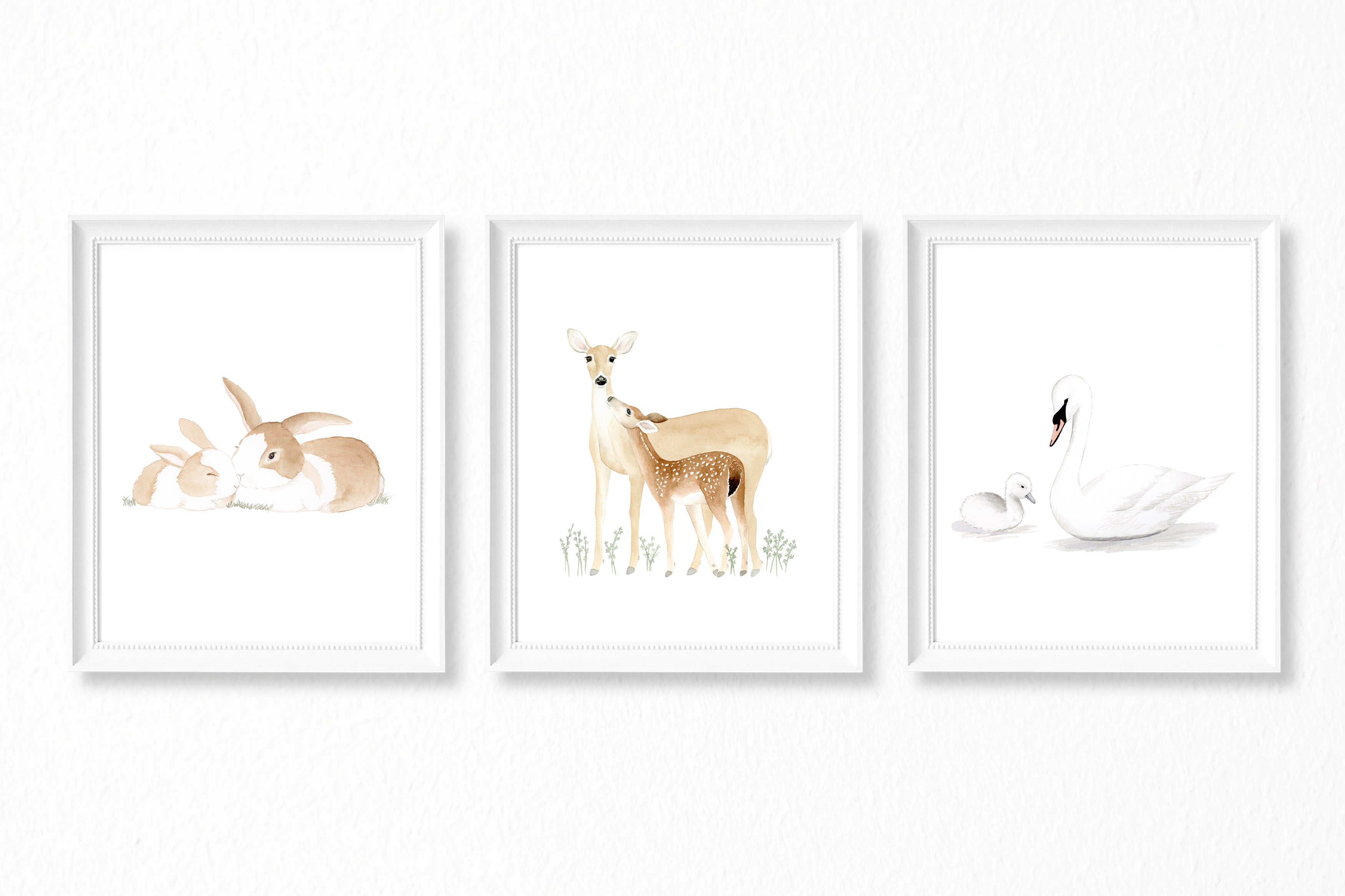 Watercolor painting of animals and babies - bunny, swan, and deer with their young. Set of 3 fine art prints.