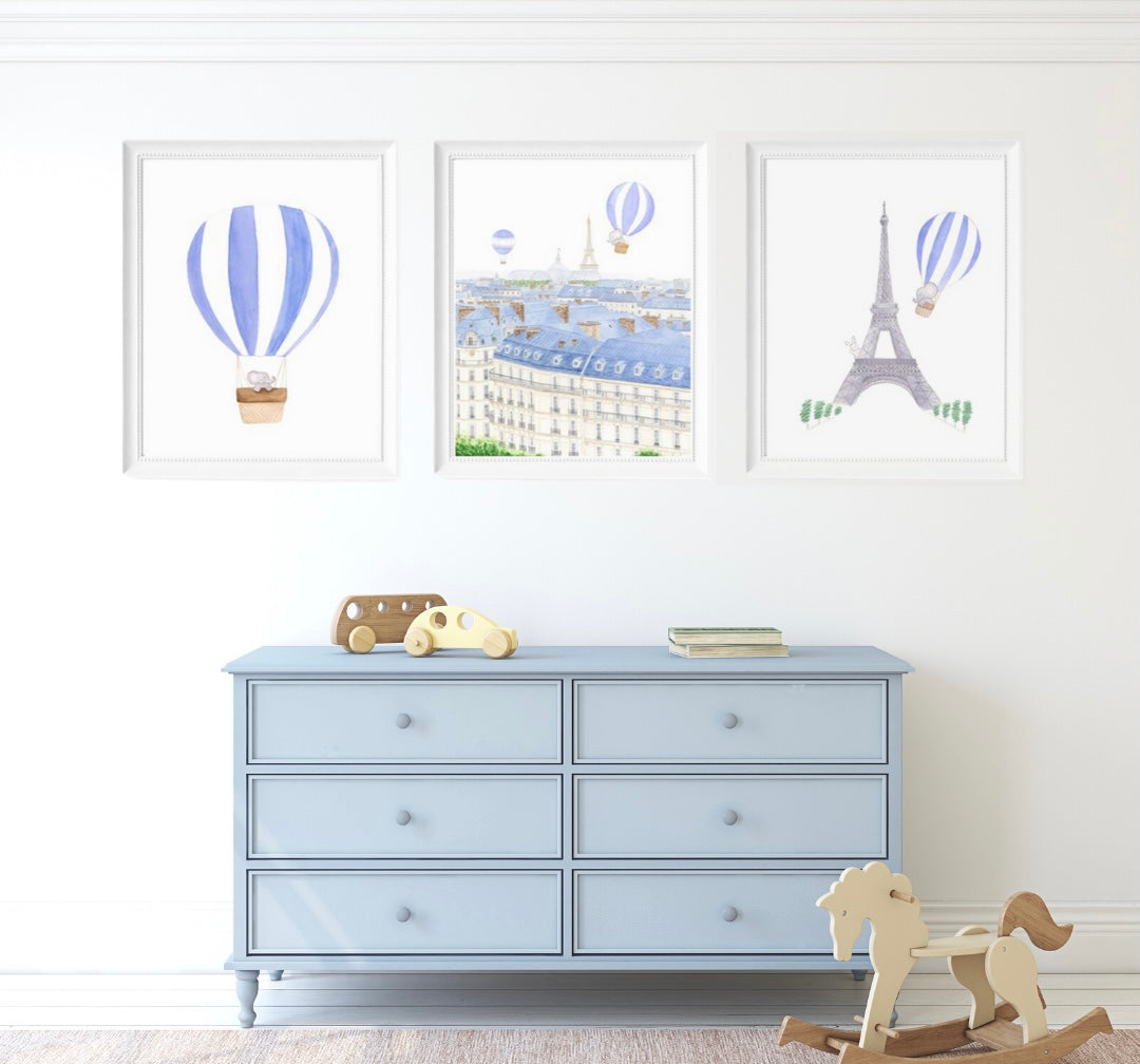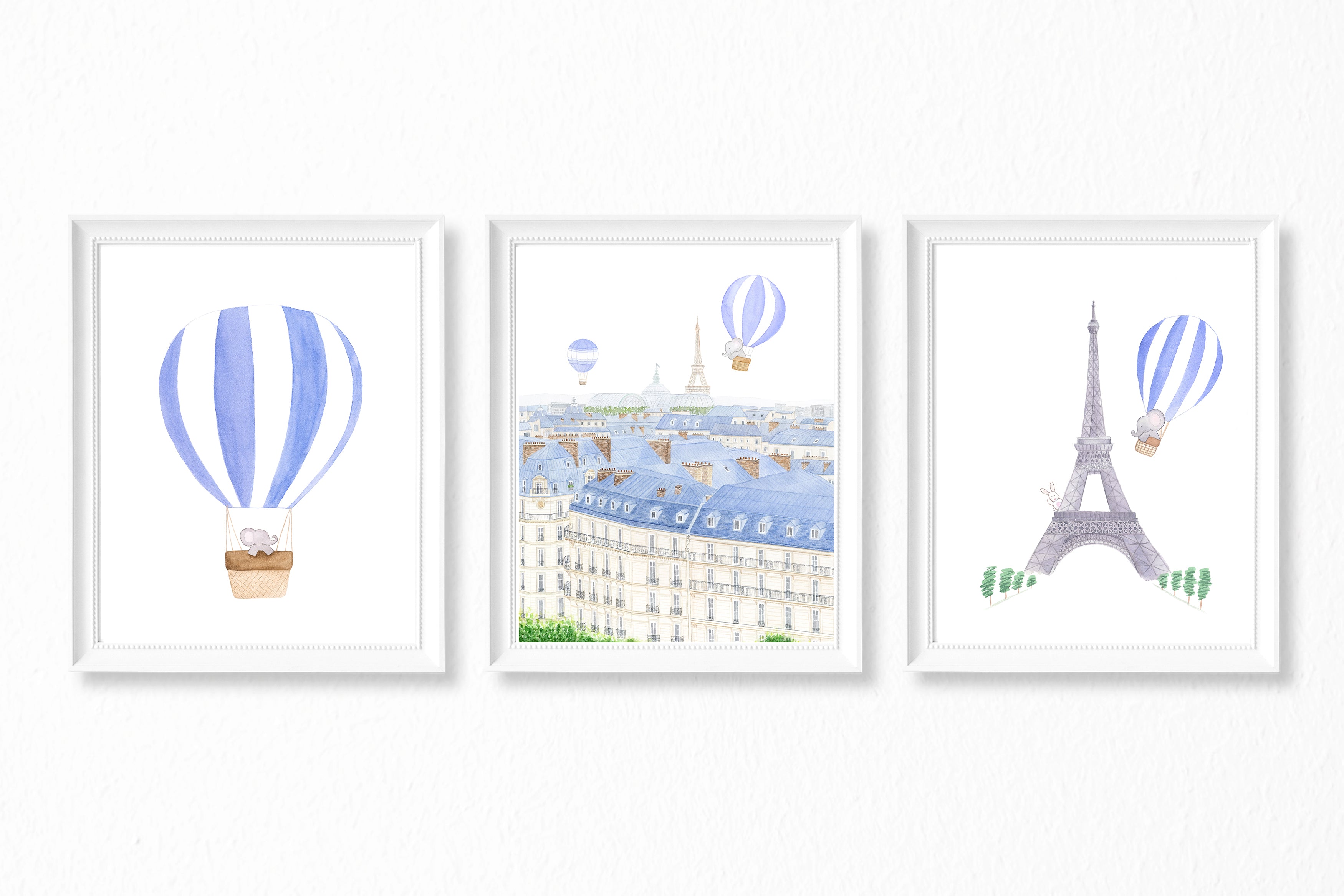 Daydream away while gazing at these Parisian rooftops - you can see the Eiffel Tower, Grand Palais, and hot air balloons in this scene. This original watercolor painting is part of a series. Baby Emma the Elephant travels the world and explores iconic locations.