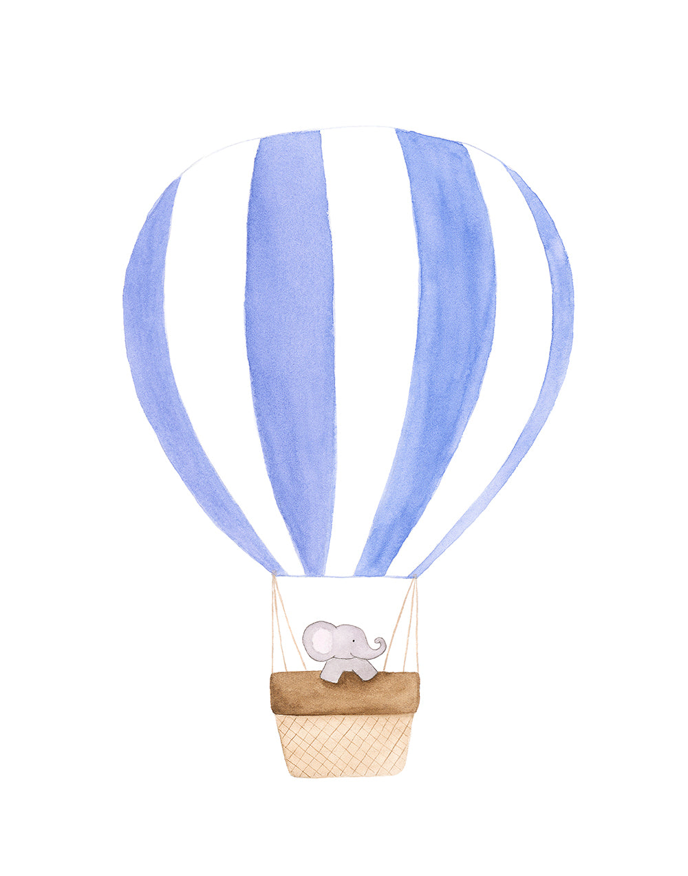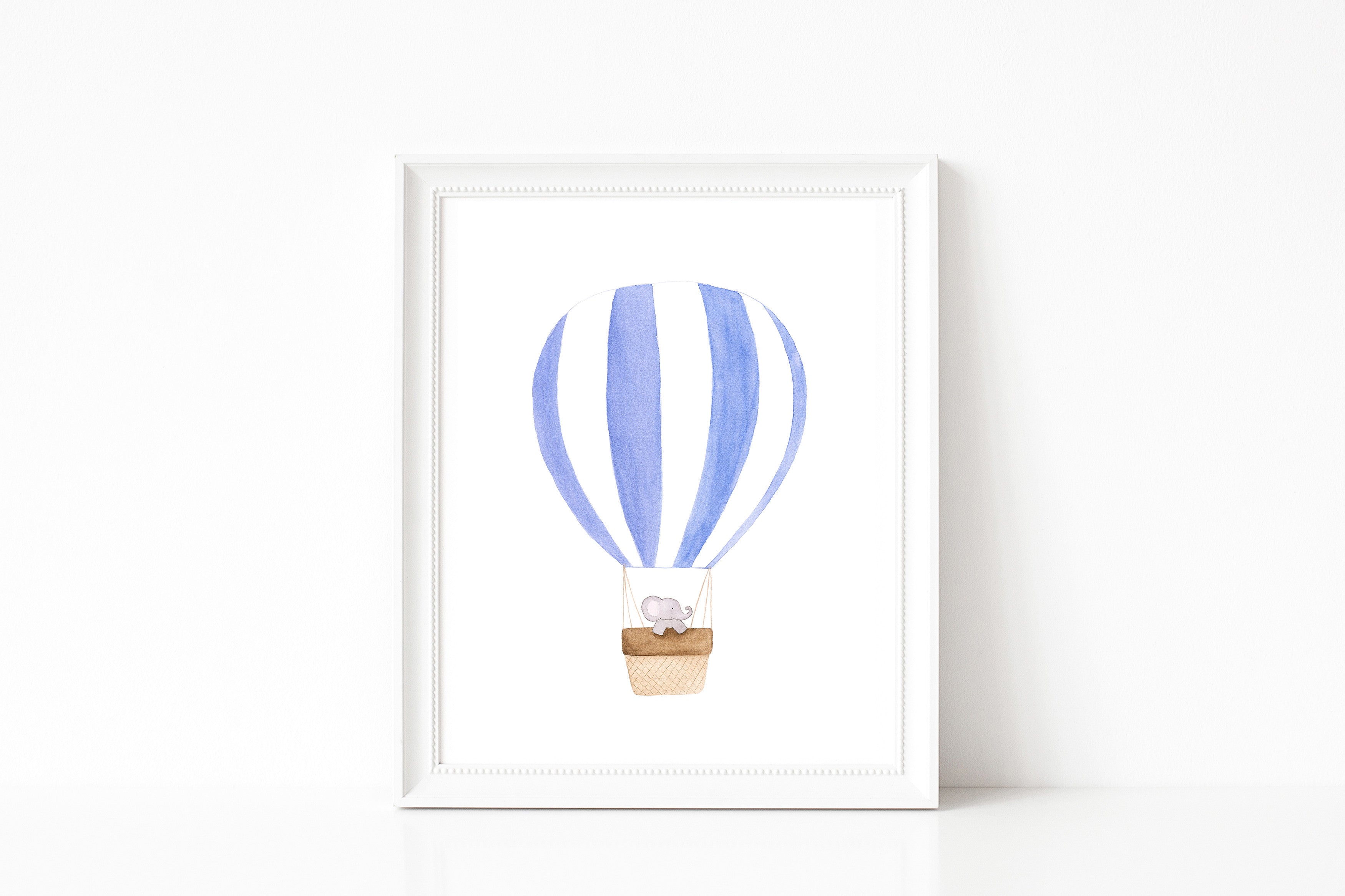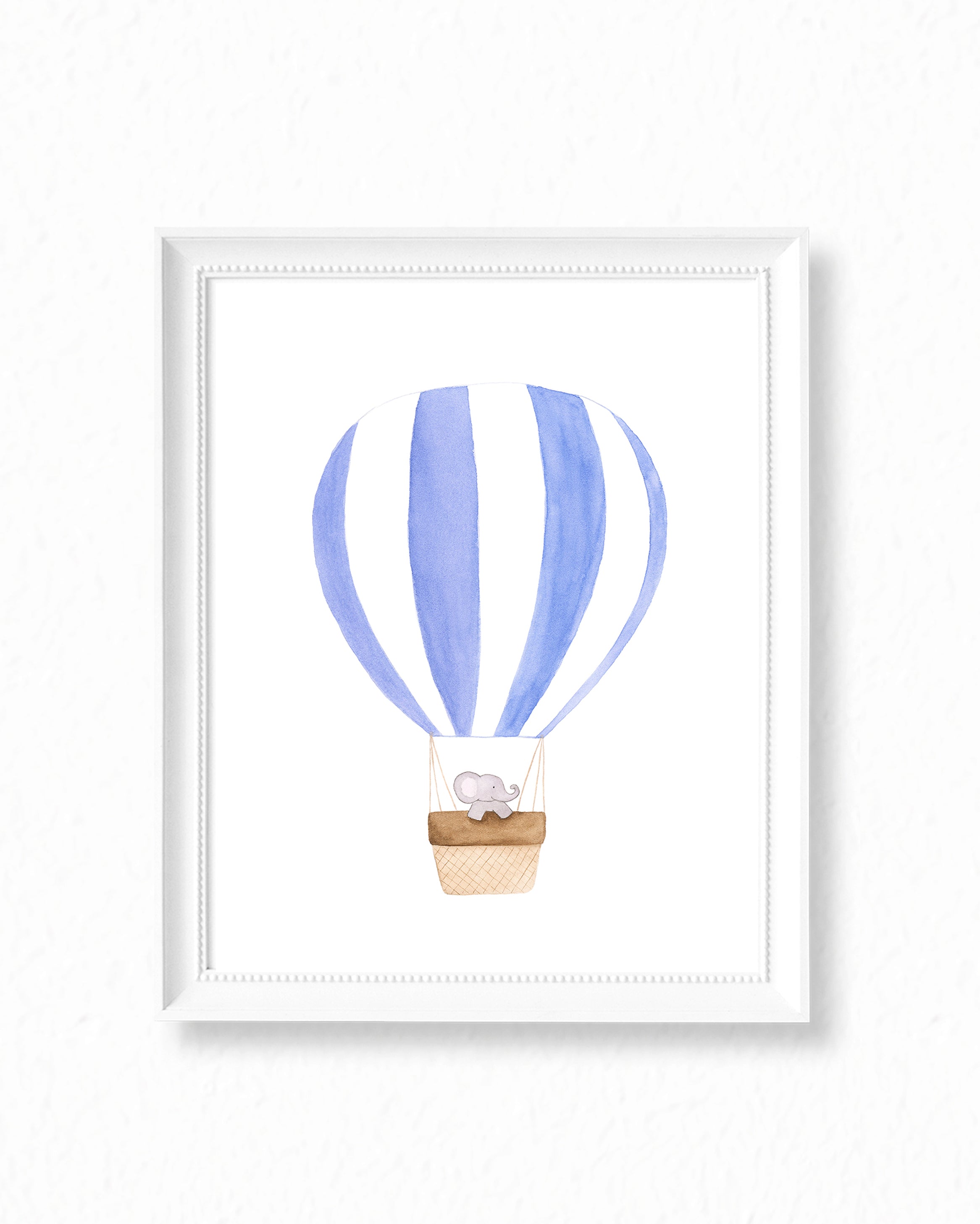 Nursery Watercolor Painting Baby Elephant Traveling in Hot Air Balloon - Art Print
