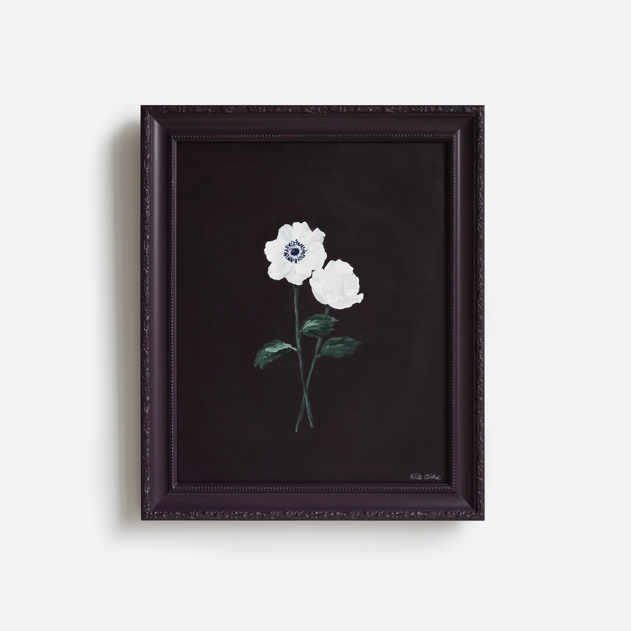Two poppy anemone flowers intertwined, representing a pure friendship, companionship, and intertwined souls. Backdrop is a deep aubergine in a hand painted antique frame, giving an old oil painting vibe.