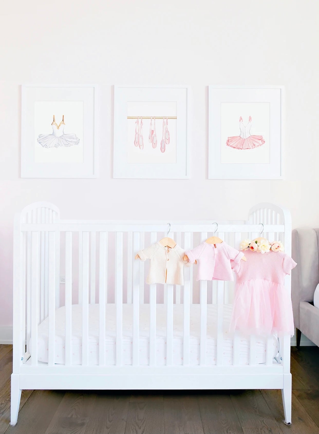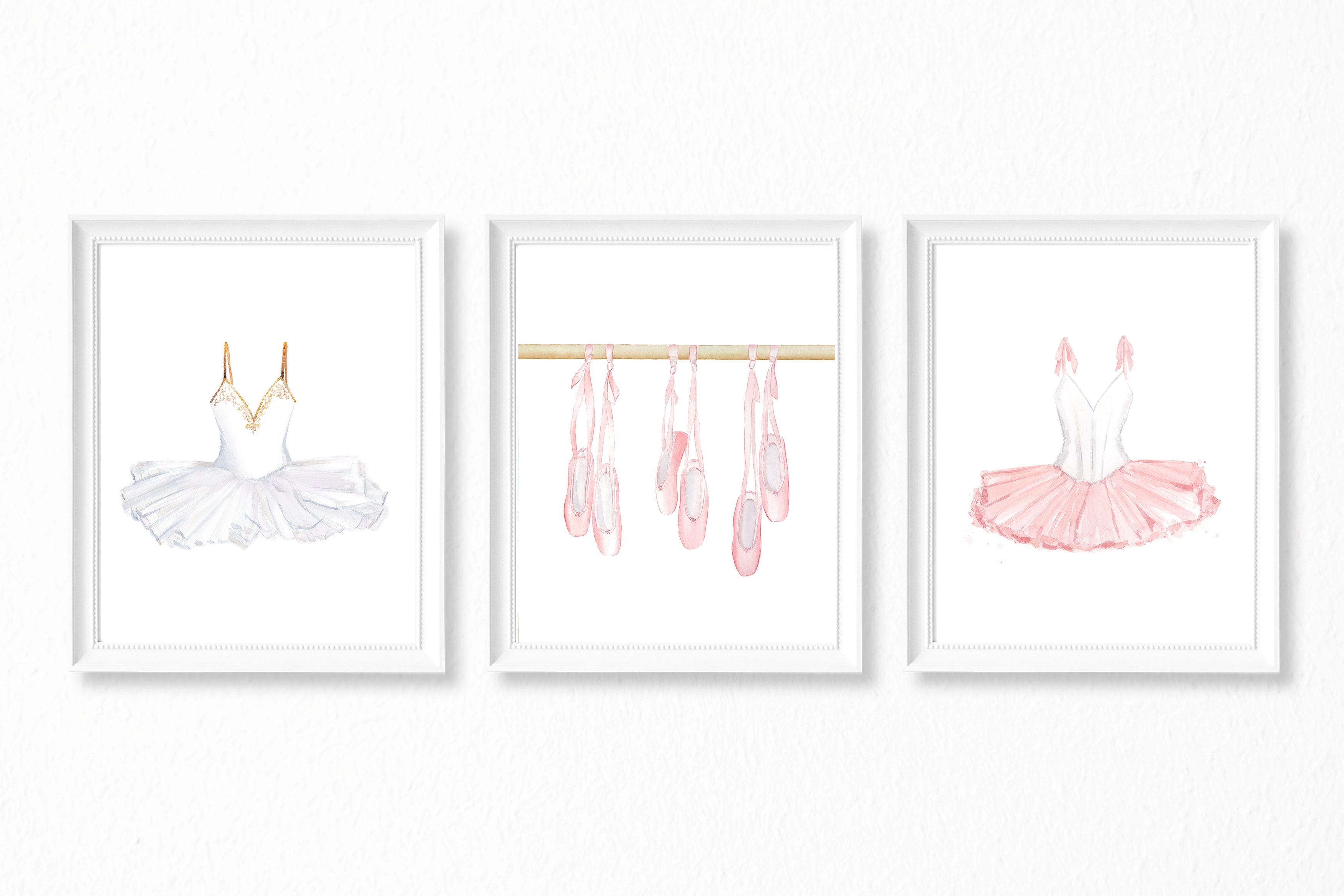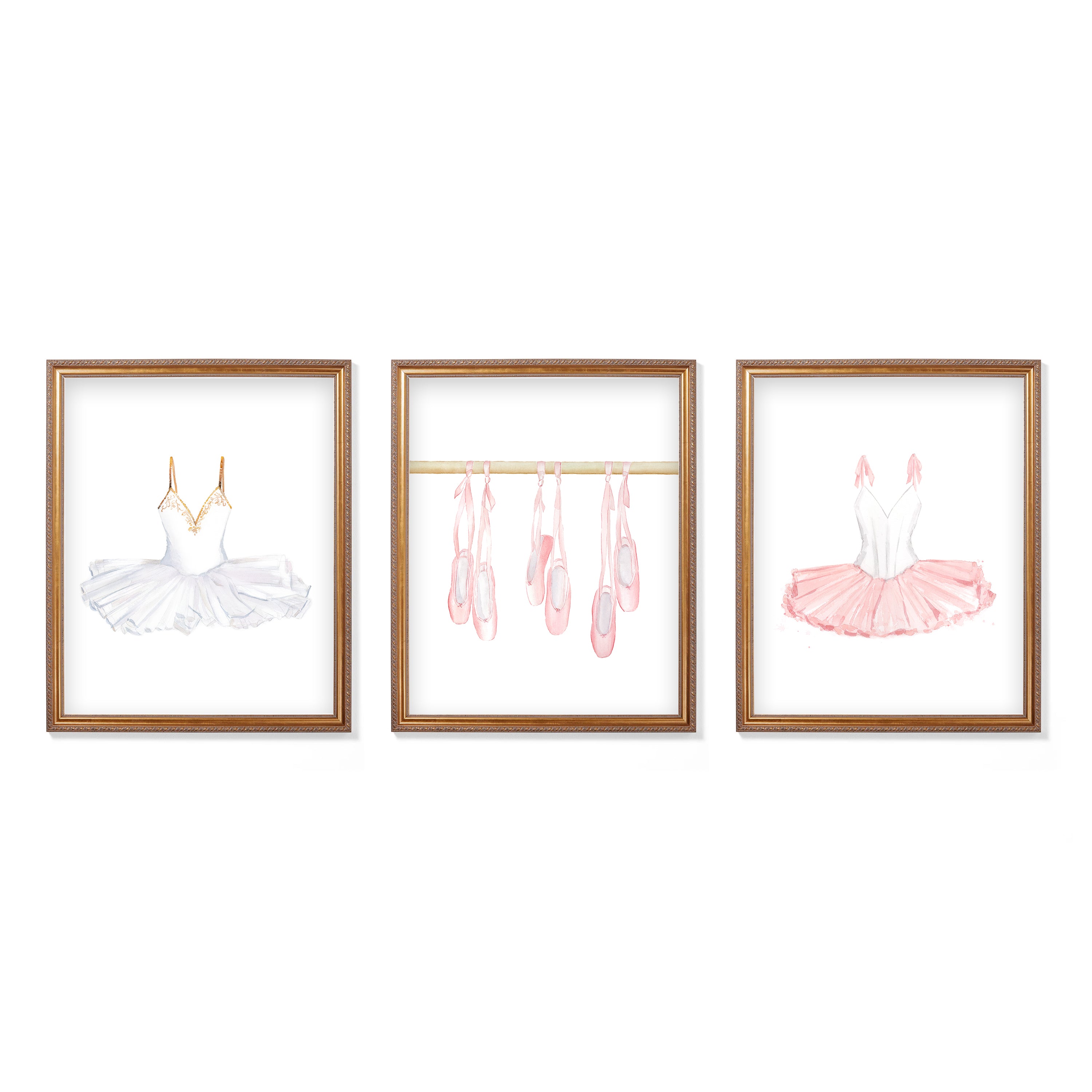 Set of 3 watercolor ballet themed paintings. Your little ballerina will love this set of pink and white ballet paintings for her room. The white tutu has gold details fit for the most elegant swan princess and the pink tutu is flowy and dreamy, perfect for your tiny dancer.
