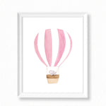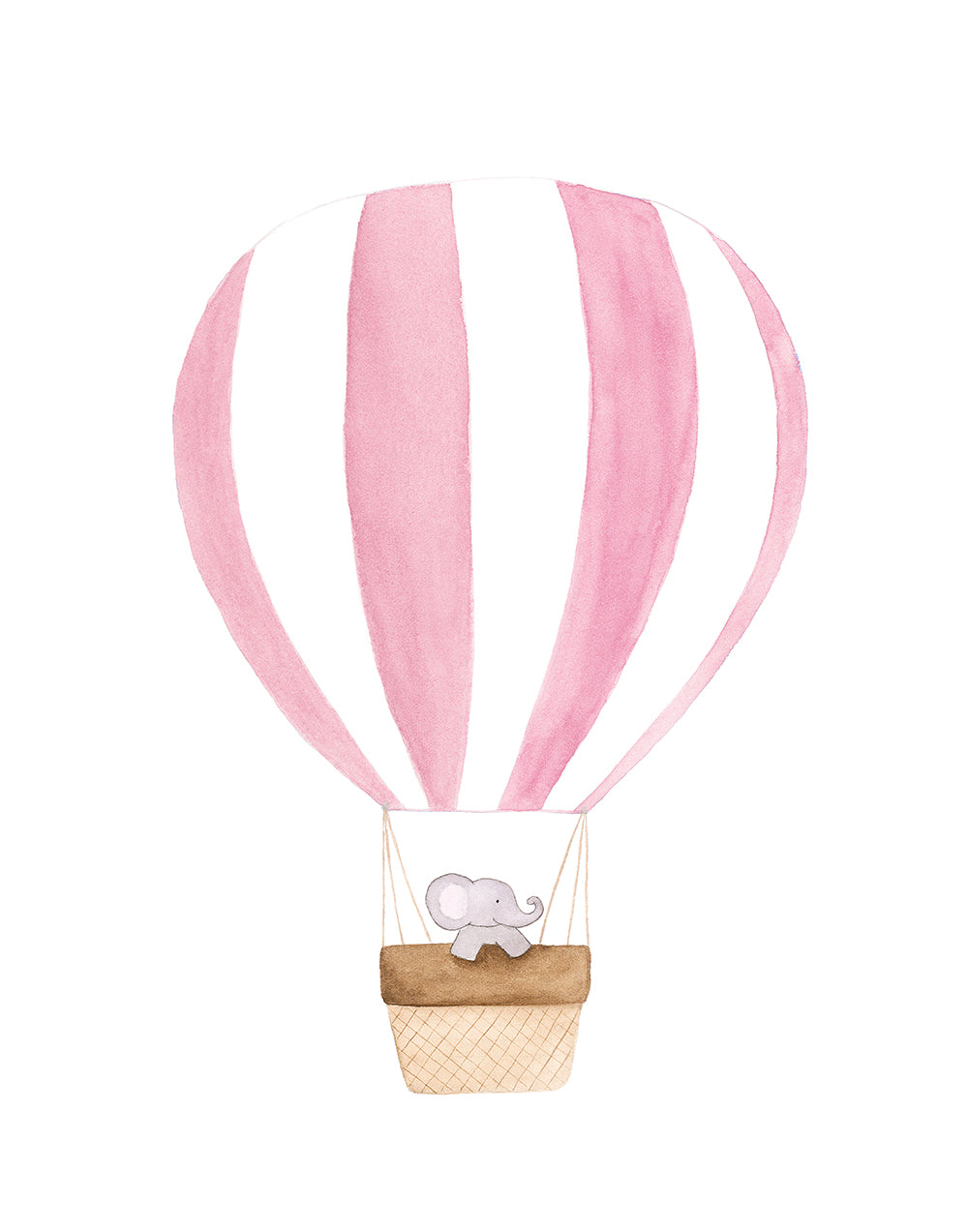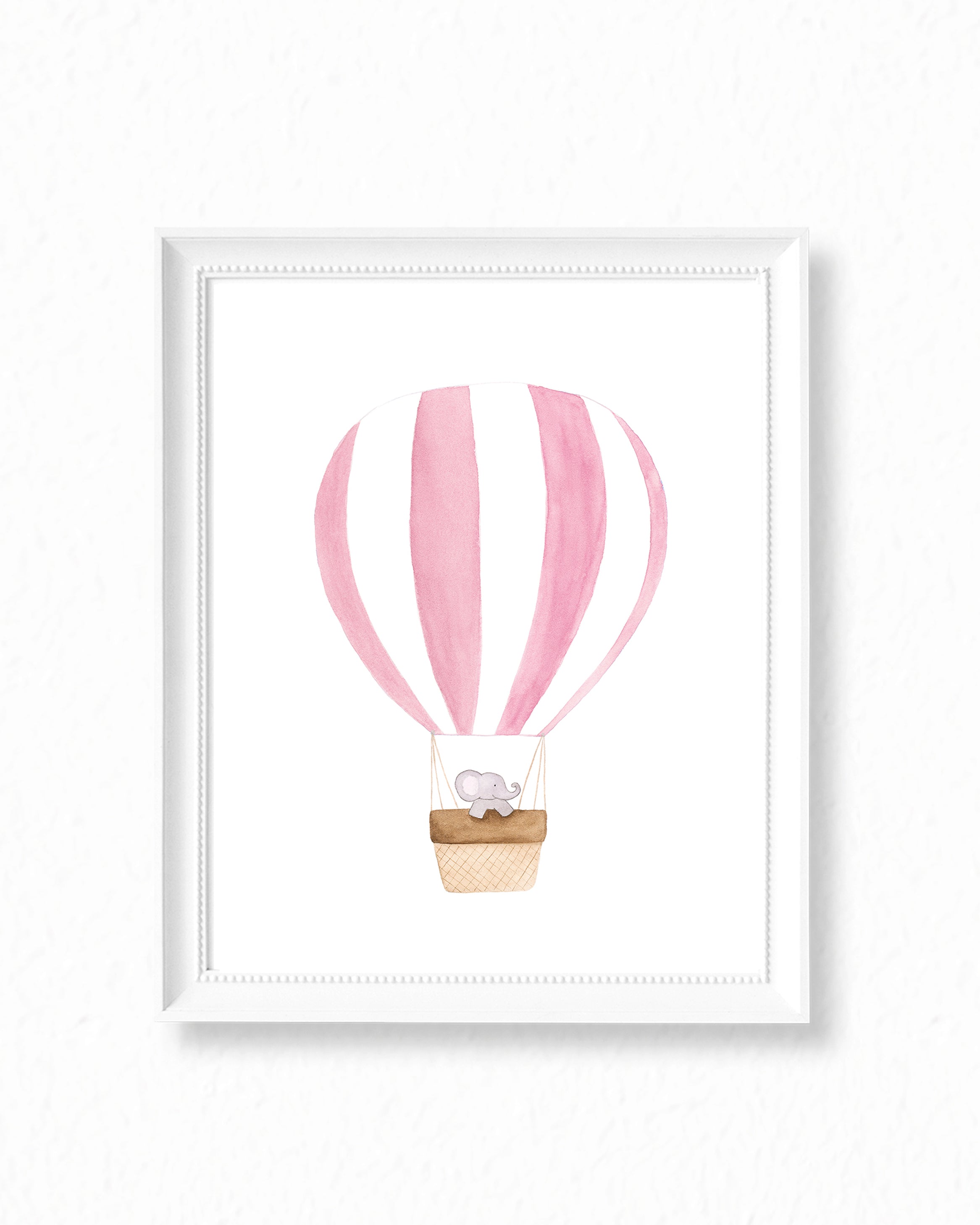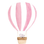 Pink Nursery Watercolor Painting Baby Elephant Traveling in Hot Air Balloon - Art Print