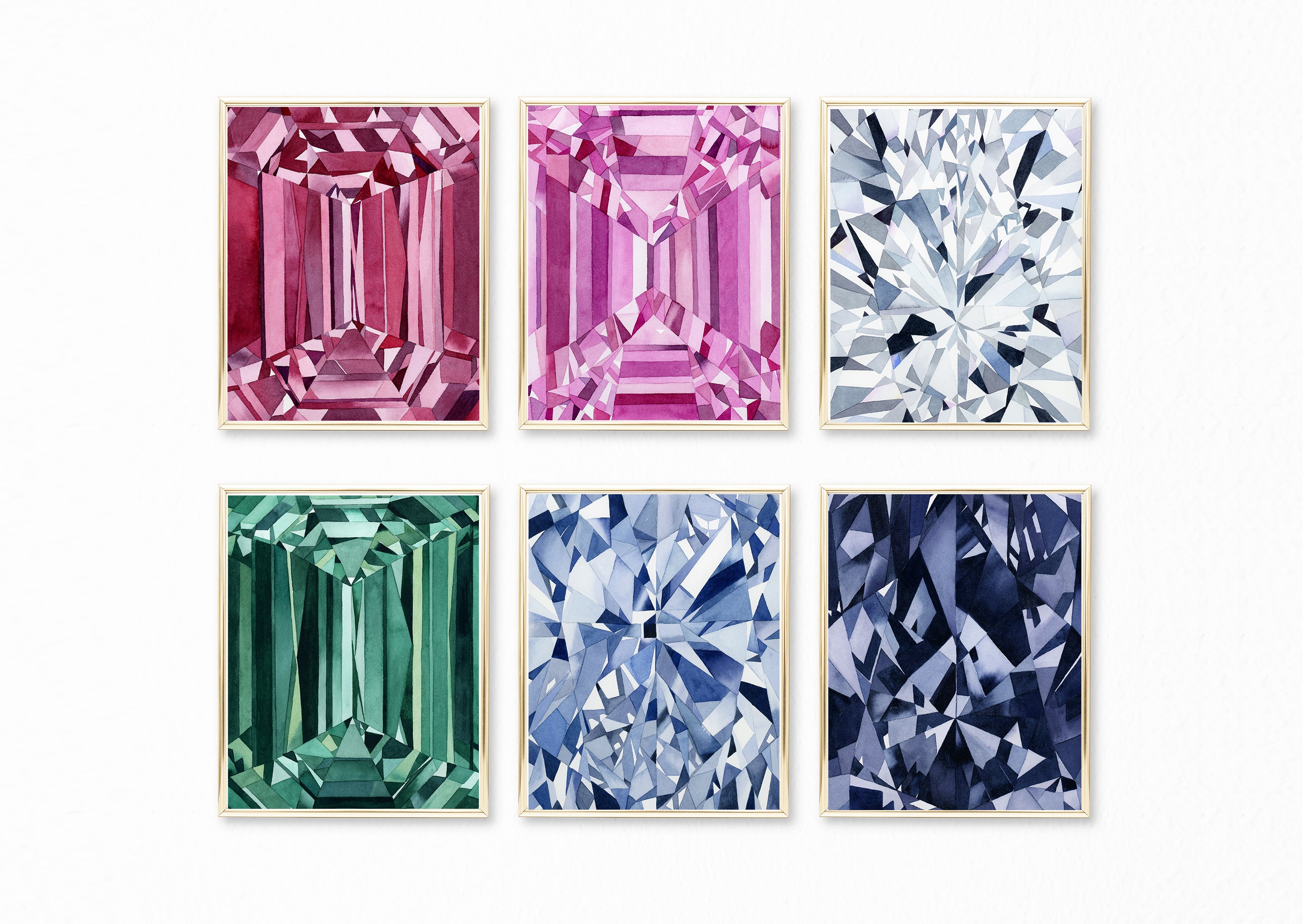 A collection of watercolor rainbow gemstone paintings in 6 different shapes and colors. Hand painted diamond and precious gemstone paintings - perfect for a sparkly, glamorous gallery wall.