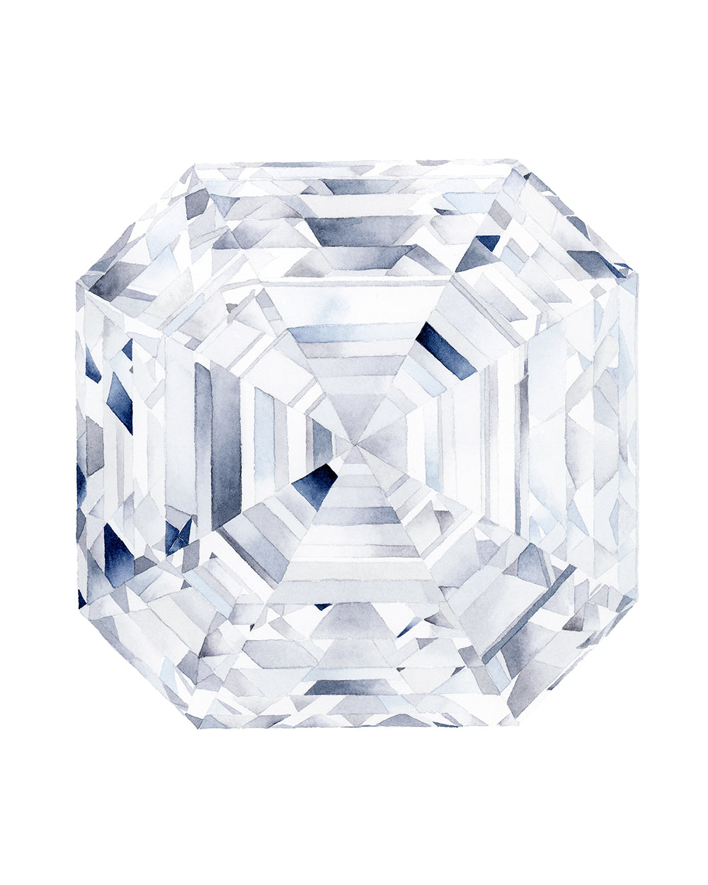 Watercolor painting of an Asscher cut diamond. The asscher cut is an elegant, distinctive shape that blends an emerald cut with a princess cut. The Art Deco geometric lines and symmetry represent sleekness and elegance. 1 watercolor art print.