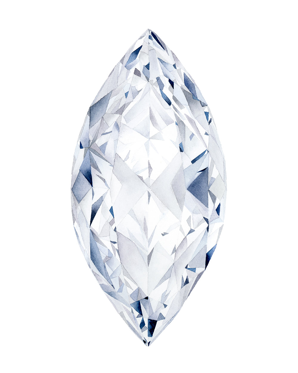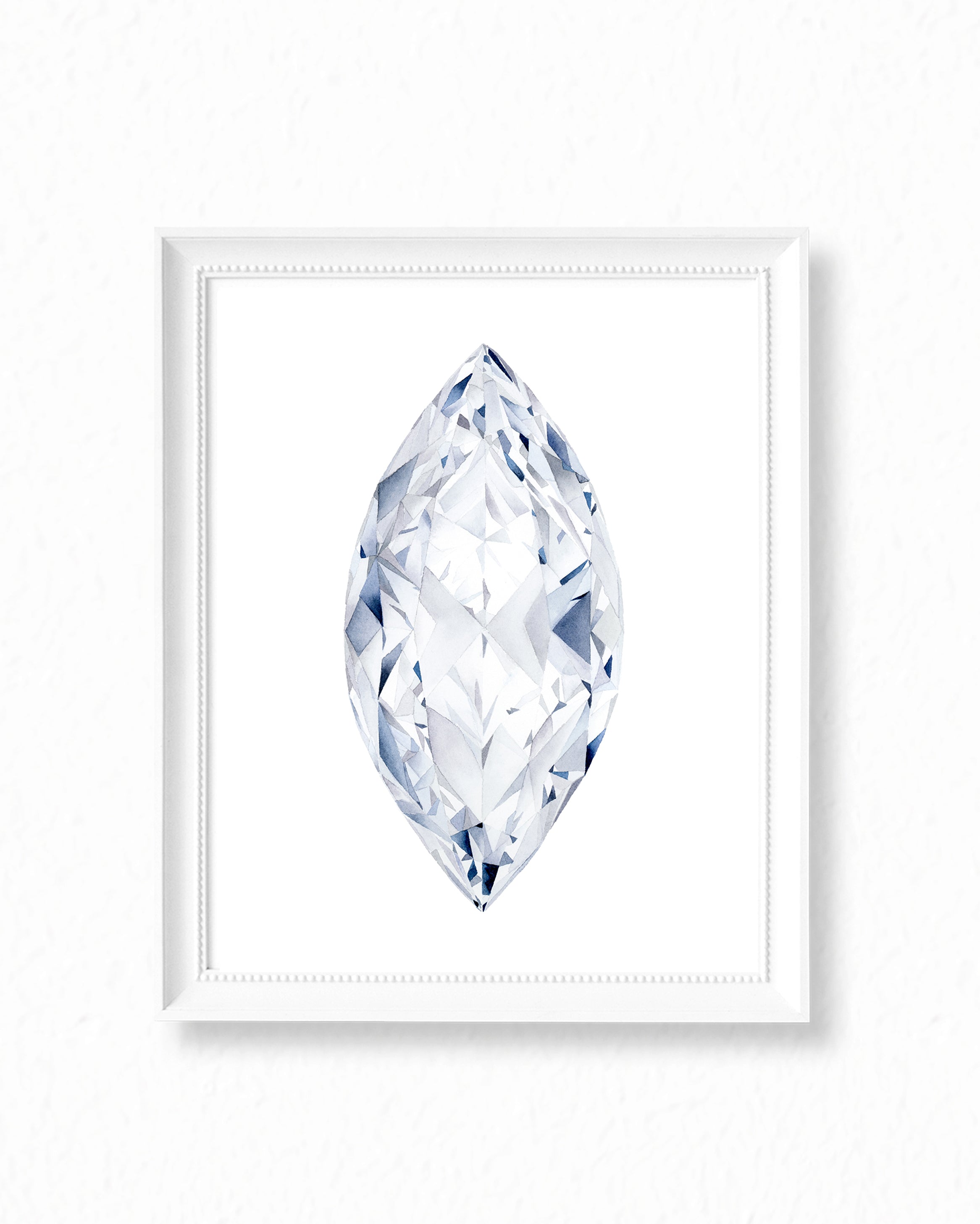 Watercolor painting of a Marquise cut diamond, the ultimate symbol of opulence and extravagance. 1 watercolor art print.